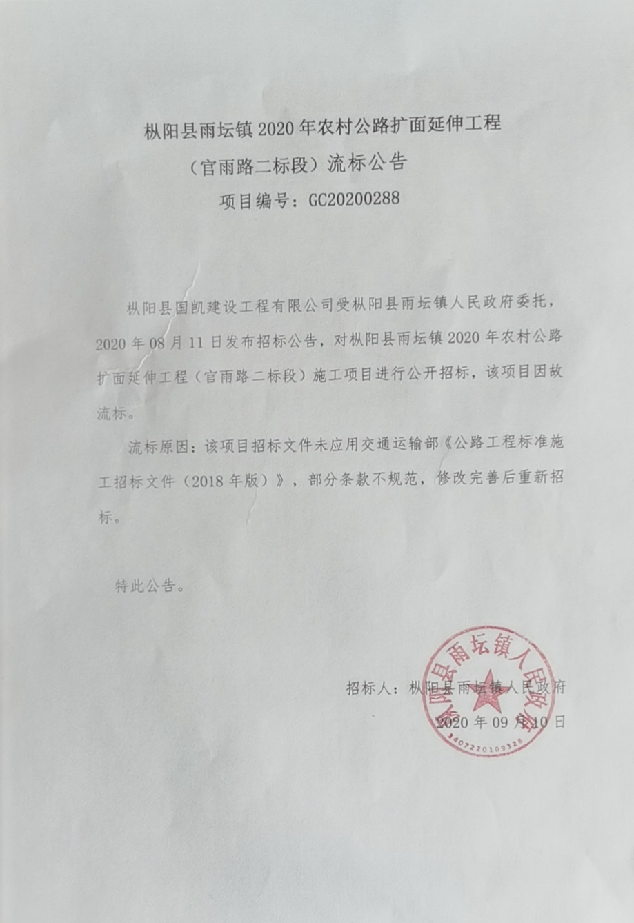 枞阳县国凯建设工程有限公司受枞阳县雨坛镇人民政府委托,2020年08月11日发布招标公告,对枞阳县雨坛镇2020年农村公路扩面延伸工程(官雨路二标段)施工项目进行公开招标,该项目因故流标。