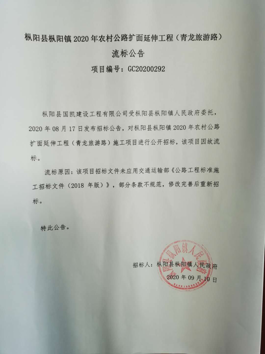 枞阳县枞阳镇2020年农村公路扩面延伸工程(青龙旅游路)流标公告