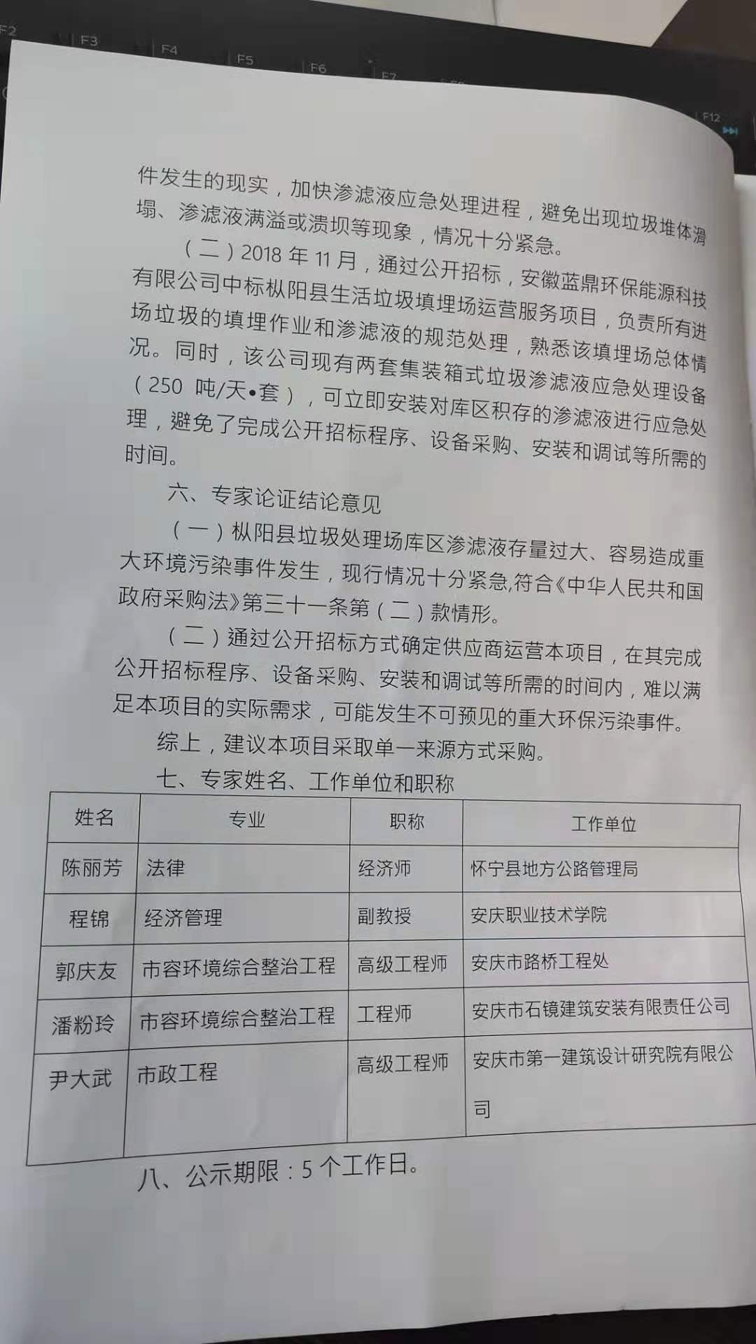 (二)2018年11月,通过公开招标,安徽蓝鼎环保能源科技有限公司中标枞阳县生活垃圾填埋场运营服务项目,负责所有进场垃圾的填埋作业和渗滤液的规范处理,熟悉该填埋场总体情况。同时,该公司现有两套集装箱式垃圾渗滤液应急处理设备(250吨/天•套),可立即安装对库区积存的渗滤液进行应急处理,避免了完成公开招标程序、设备采购、安装和调试等所需的时间。