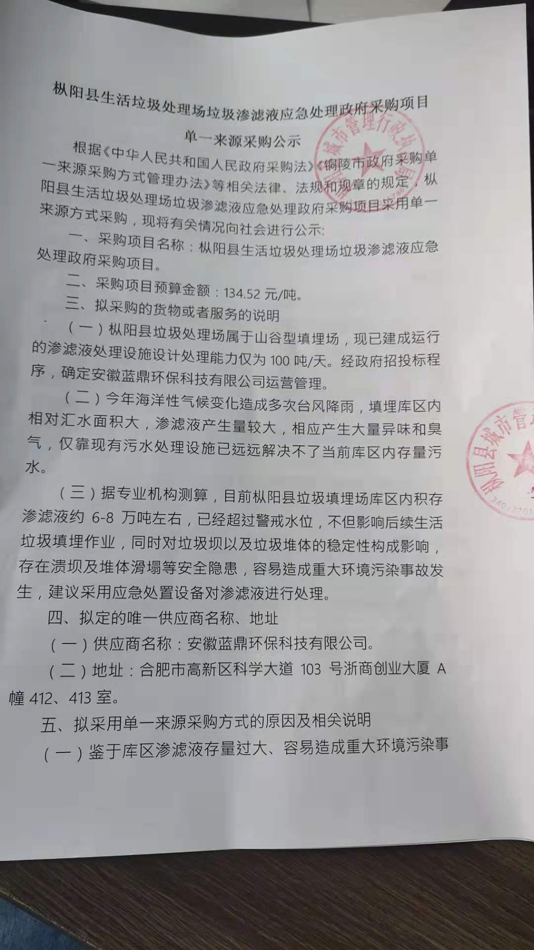 根据《中华人民共和国人民政府采购法》《铜陵市政府采购单一来源采购方式管理办法》等相关法律、法规和规章的规定,枞阳县生活垃圾处理场垃圾渗滤液应急处理政府采购项目采用单一来源方式采购,现将有关情况向社会进行公示: