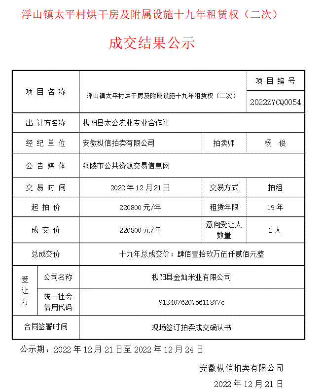 【其他交易成交公告】浮山镇太平村烘干房及附属设施十九年租赁权(二次)