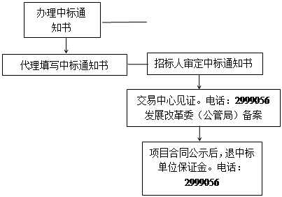 3、办理流程:项目中标候选人公示期结束后,代理机构在系统内填写中标通知书并签章,招标人核发,县交易中心见证,县发展改革委(公管局)备案确认,形成电子版中标通知书。