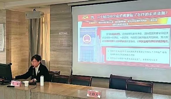 本次活动特邀铜陵学院马克思主义学院概论课教研室主任、教授蒋丽作专题辅导。蒋教授以《学习党的二十届四中全会精神 勇担“十五五”现代化新使命》为题,围绕党的二十届四中全会的内涵、“十五五”规划编制的重要性、“十四五”成就和“十五五”的发展目标做了全面精炼的阐释,强调要从“学深悟透、干在实处、惠及民生”等方面发力,切实把思想和行动统一到党中央决策部署上来,增强贯彻落实的思想自觉和行动自觉。